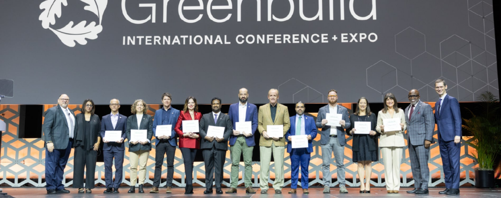 Huard provides “I have known George Bandy Jr. since 2013 when he became USGBC Board of Directors Chair-Elect in 2013 and I was serving on a LEED Committee. for as long as I have know George he has been steadfast related to steadily advocating for Green Building and Materials Transparency. George became the 2014 USGBC Board of Directors Chairperson and I worked collaboratively with him during that era.” Huard and Bandy continued their collaboration ten years later with Huard as the Global Chairperson of the LEED Fellow Evaluation and Selection Executive Committee and George Bandy Jr. as the Board of Directors Chairperson of Green Business Certification Inc. The image above has Huard on the far left and Bandy second from the far right in the image with the 2024 Class of LEED Fellows onstage at the Greenbuild Leadership Awards Ceremony.